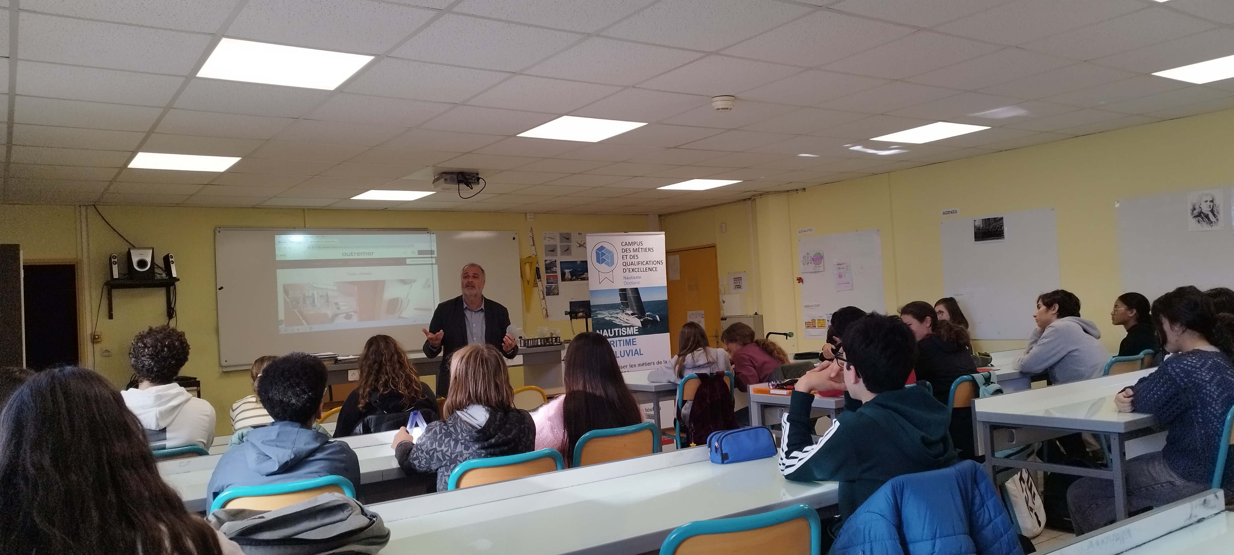 Lundi dernier les élèves de 4e1 de la classe coloration Mer de notre établissement, ont eu la visite de Guillaume Philippe, Directeur Opérationnel du Campus des Métiers et des Qualifications du Nautisme d’Occitanie et plaisancier expérimenté. Lors de cette conférence il a présenté aux élèves, les métiers de la filière nautique.